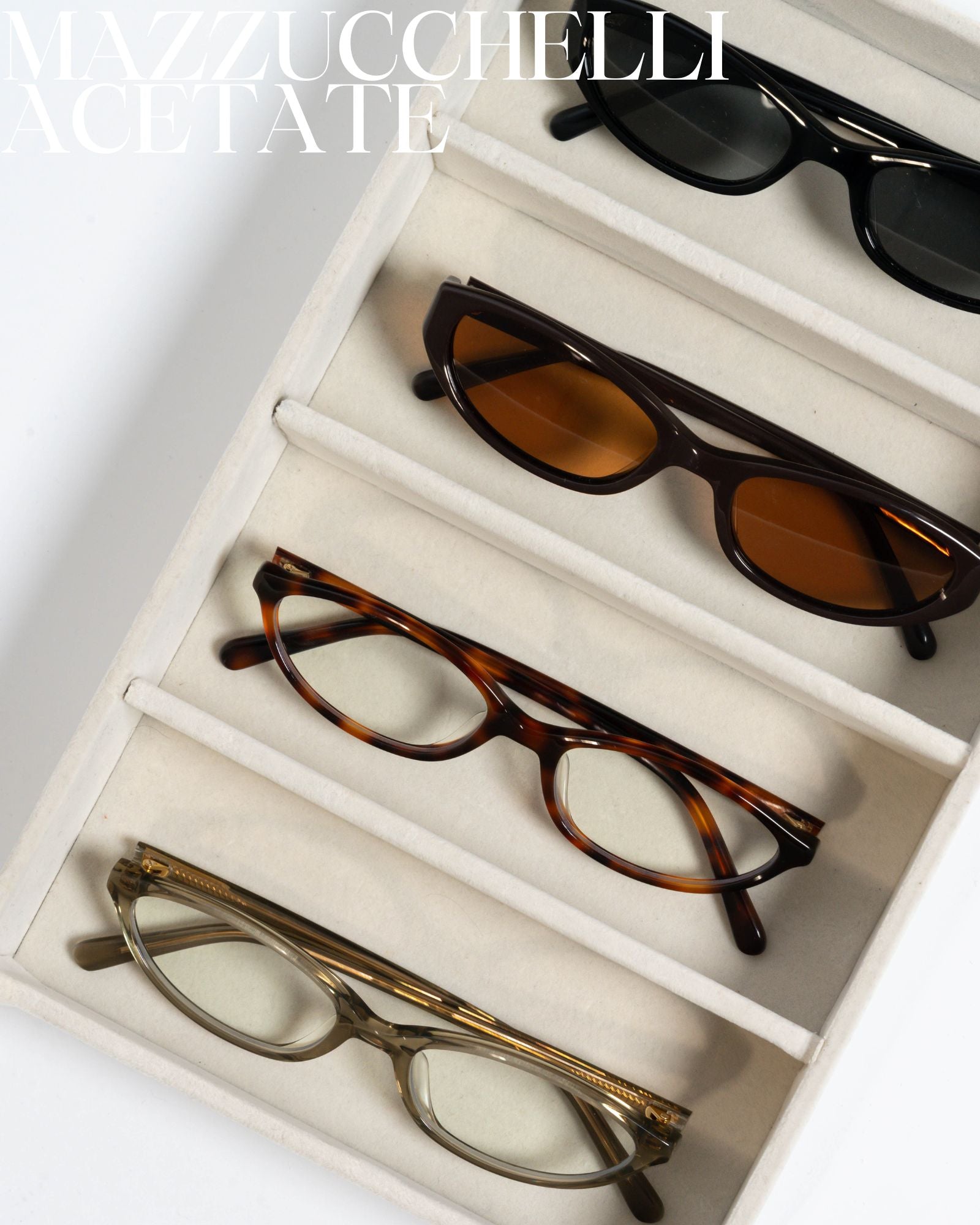 Handcrafted from Mazzucchelli cellulose acetate, shaped by six generations of Italian mastery, these frames are durable, lightweight, and scratch-resistant, yet sculptural and expressive. Each curve and contour is designed to move with your life, withstand daily wear, and reflect a refined, timeless style that evolves with you.